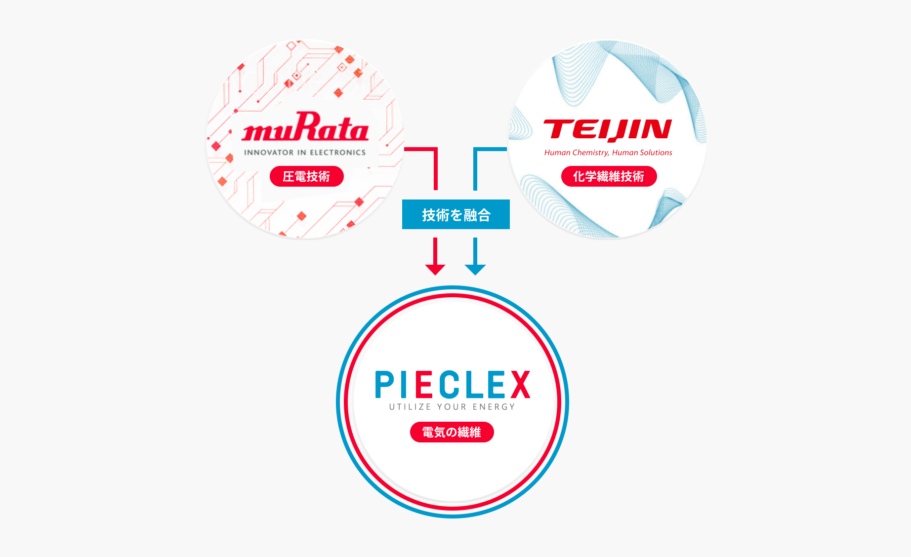 株式会社村⽥製作所(本社: 京都府⻑岡京市、代表取締役会⻑兼社⻑: 村⽥ 恒夫)と帝⼈フロンティア株式会社(本社: ⼤阪府⼤阪市北区、代表取締役社⻑執⾏役員: ⽇光 信⼆)は、世界初となる、⼒が加わることで電気エネルギーを⽣み出し抗菌性能を発揮する圧電繊維「PIECLEX(ピエクレックス) 」を共同開発しました。 また、この繊維の研究・開発および製造・販売を⽬的に、2020 年4⽉1⽇には両社の合弁により株式会社ピエクレックス(本社: 滋賀県野洲市、代表取締役社⻑: ⽟倉 ⼤次)を設⽴しました。