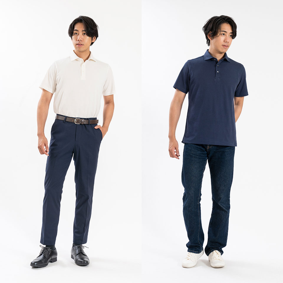 本製品は、ドレスシャツのようなワイドカラー仕立てで、ポロシャツというカジュアルさの中に上品さとフォーマルさを兼ね備えたデザインです。クールビズスタイルにも適しており、オフィスや商談などビジネスシーンにもしっかりと適応。毎日の通勤服としても、プライベートで着用する一着としても清潔感と快適性を両立した一枚です。