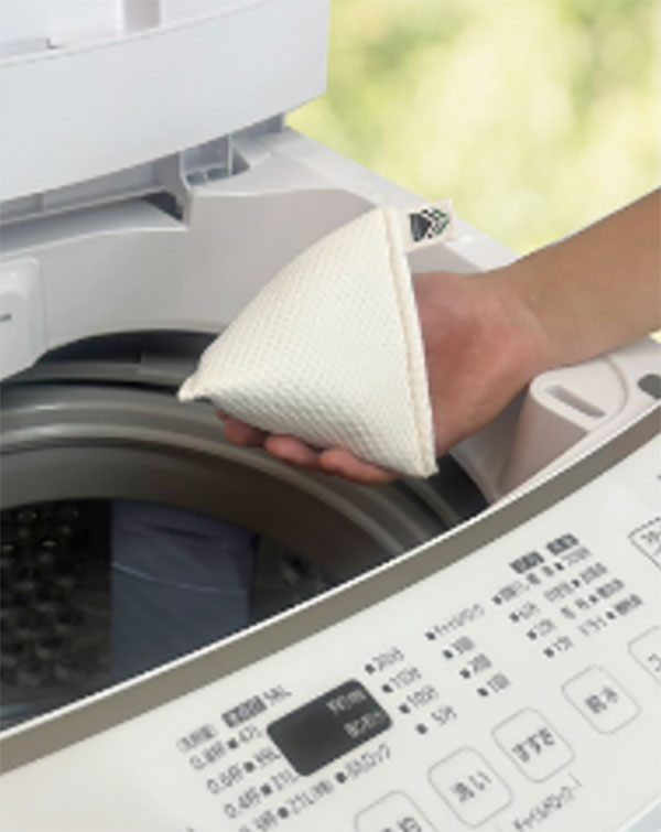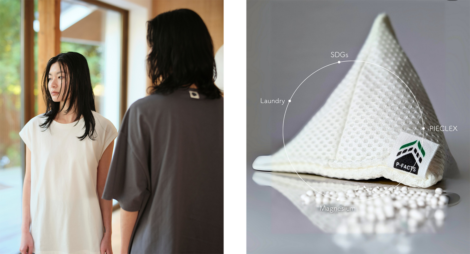 2024年に発売された、「洗たくマグちゃん with ピエクレックス」は、植物由来繊維ピエクレックスを袋に採用しています。ピエクレックスが主導する循環インフラ「P-FACTS」(ピーファクツ)※2に対応しており、使用後の製品は回収され、生地は微生物によって堆肥化される循環設計です。