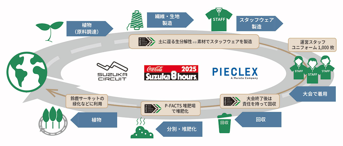 このような状況を踏まえ、2025年大会よりピエクレックスが推進するアパレルの循環インフラ「P-FACTS」(ピーファクツ)に対応したスタッフウェアを導入。大会終了後は、P-FACTSの仕組みを活用し、回収・分別・堆肥化し、堆肥をサーキット内の緑化や植栽、周辺地域の農業等に活用することで、新たな「循環」の創造を目指しています。また、P-FACTS対応素材の使用により、CO2排出量の削減※1も図ります。