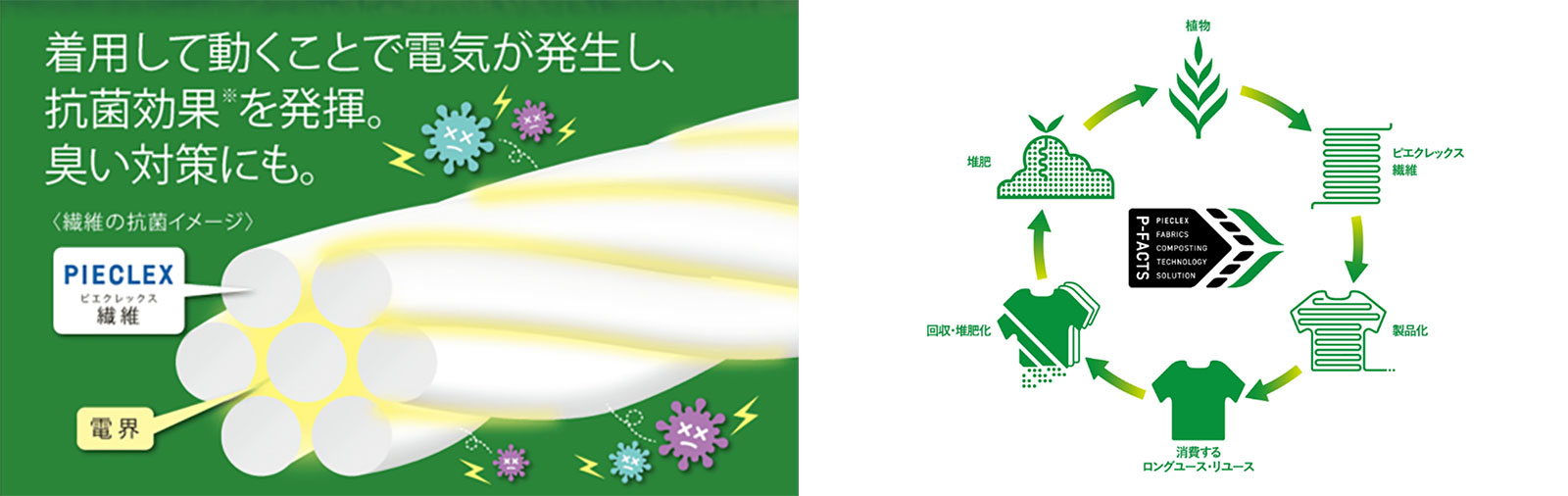 本製品に採用された「電機の繊維」ピエクレックスは、人の動きで繊維が動くことで微弱な電気を発生し、抗菌効果※1を発揮。臭いの元となる菌にも有効で臭い対策にも適しています。「外遊び」をコンセプトに展開するgo slow caravanユーザーの皆さまに是非お手に取っていただきたい一着です。