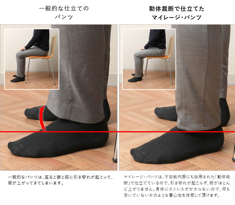 「マイレージ・パンツ」Voyage(ヴォヤージュ)の設計の核となるのが、丸和繊維工業株式会社が独自に磨き上げてきた「動体裁断®」と「動体縫製®」という技術です。